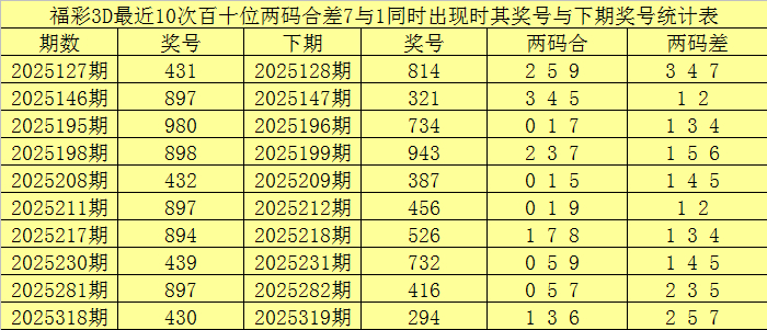 福彩3D第2025347期奖号两码合差分析: 百十位合差分析:上期奖号百十位开出89组合,两码合为7,两码差为1,最近10次百十位两码合7与两码差1同期出当前,其奖号和下期奖号分裂为: