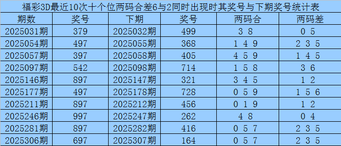 从以上统计不错看出,百个位两码合差5与1同期出现之后其下期两码合差证实最热的4个分裂为:0123,本期百个位两码合差不错参考这四码中的数据。 下期开出最热的四码分裂为:1457,本期珍重这四码包含百个位中的奖号。 十个位合差分析:上期奖号十个位开出97组合,两码合为6,两码差为2,最近10次十个位两码合6与两码差2同期出当前,其奖号和下期奖号分裂为: